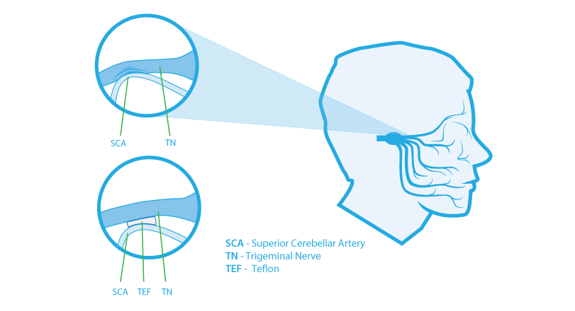 The excruciating facial pain of Trigeminal Neuralgia is caused by compression of the trigeminal nerve at the root entry zone by a blood vessel in 96% of cases. The offending vessel is usually a tortuous loop of the superior cerebellar artery although other vessels can be involved. The neurosurgeon can perform direct microvascular decompression of the trigeminal nerve. This achieves long term complete pain relief in the majority of patients and avoids destruction of the trigeminal nerve, thereby avoiding the complications of facial numbness, dysesthesia, corneal anesthesia and ulceration as well as the dreaded anesthesia dolorosa (extreme constant burning pain after neural destructive procedures).